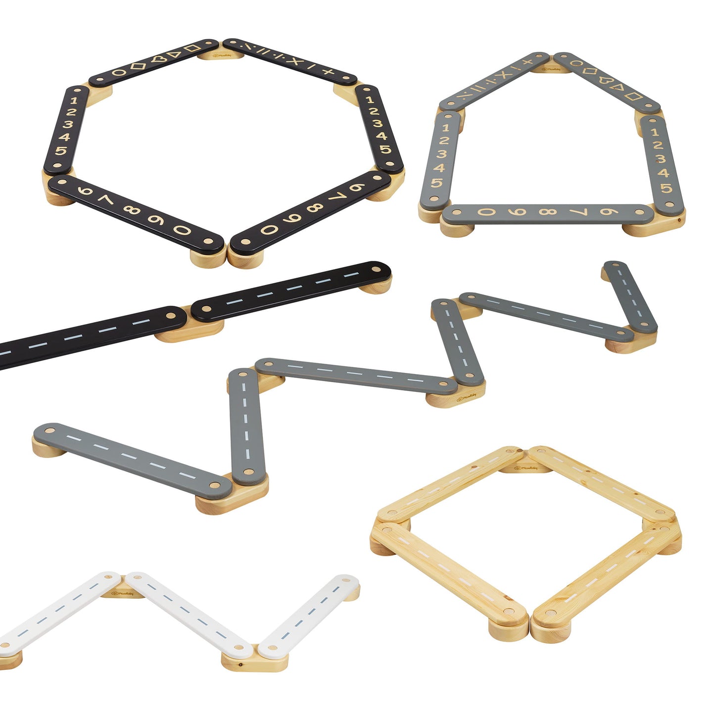 Wooden Balance Beam with 4 elements. Educational, sensory path made of natural, pine wood and varnished with water-based paints. The path has graphic and numerical signs milled, which allow your children to learn about numbers, geometric figures and mathematical signs. Moreover, you can turn the path upside down and use as a road for your car toys. Walking on the path allows your child to exercise balance and the possibility to arrange them in different shapes develop imagination. This creative way of having fun is ideal for children, who learn about counting and basics of mathematics. Thanks to the use of natural wood, the path is stable and safe for children to play with and the use of water-based paints make this toy environmentally friendly.